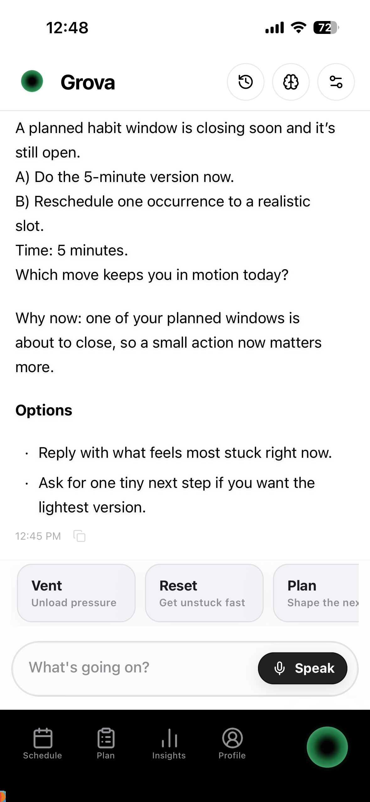 Grova turns goals into a day you can actually follow and keeps the plan connected to what really happened.