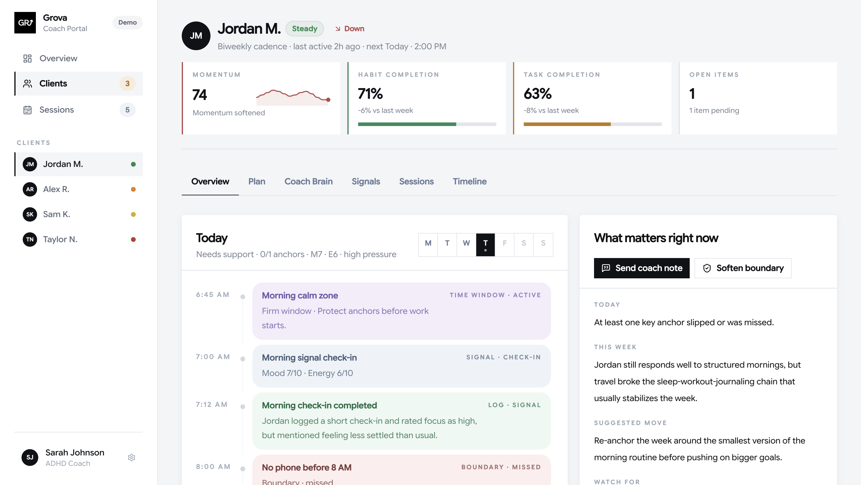 Grova helps you see the patterns, check-ins, and behavior shifts happening between sessions, so you know where to focus before the call.