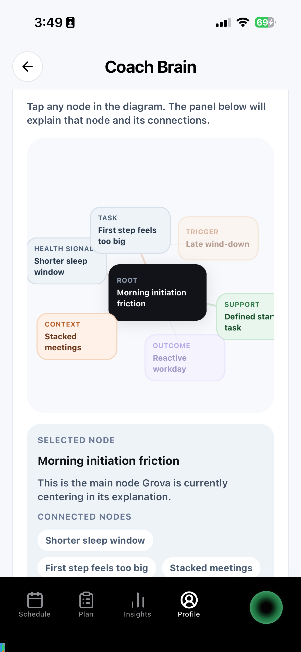 Grova helps you understand what throws you off, build around real life, and adjust faster when your day starts to slide.